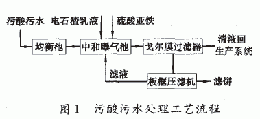 污酸污水處理工藝流程如圖1。來自冶煉系統(tǒng)和制酸系統(tǒng)的污酸污水引人均衡池混合;混合后,污酸污水由泵輸送到中和曝氣池,達到一定液位后,向中和曝氣池內(nèi)投加、[Ca (O H ),」為20%左右的電石渣乳液,調(diào)整pH值為7.8一8.0,使污酸污水中的氟離子、重金屬離子和部分砷沉淀,再根據(jù)污酸污水中砷化物含量投加適量FeS04,同時向混合液中通人壓力為50 kPa左右的空氣進行攪拌并起氧化作用,保證反應(yīng)充分并促進Fe(OH)2氧化成絮凝效果好的Fe(OH)3膠體,將廢水中的亞砷酸及亞砷酸鹽沉淀;曝氣反應(yīng)完全后,根據(jù)污酸污水中重金屬離子含量的高低,決定是否微調(diào)pH值至8.5一9.0 ; 中和曝氣反應(yīng)后的污酸污水通過戈爾膜過濾器進行固液分離,上部清液達標返回生產(chǎn)系統(tǒng)循環(huán)利用,底流經(jīng)板框壓濾機壓濾,濾渣無害化堆存,濾液返回中和曝氣池。