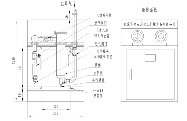 乙炔氣點(diǎn)閥箱主要由進(jìn)氣控制閥門(mén)、止回閥、貯氣裝置(內(nèi)裝適量阻火填料)、乙炔減壓器、分流控制裝置、干式乙炔回火防止器、出氣接頭(束裝)和箱體組成。箱體背面有4個(gè)φ14的安裝孔,可供掛壁安裝。箱體正面板上安裝有進(jìn)氣壓力表和出氣壓力表,可同時(shí)供一把或多把切割槍使用乙炔氣,調(diào)壓方便,壓力穩(wěn)定,安全可靠,是乙炔氣用氣點(diǎn)的理想設(shè)備。