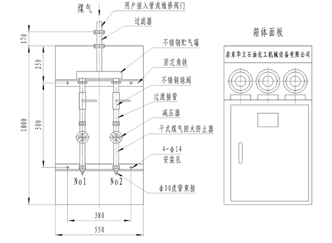 2、箱體正面板上安裝有進(jìn)氣壓力表和出氣壓力表,直接監(jiān)控管道壓力和使用壓力。
