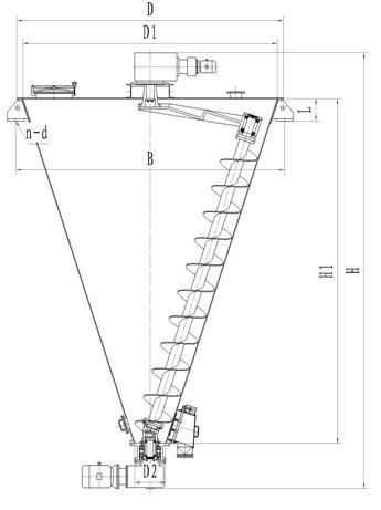 本機主要由錐型筒體、螺旋軸、公轉傳動臂、自轉轉動頭及出料閥組成。物料由上部加入。上部減速機帶動公轉傳動臂使螺旋軸在筒體內(nèi)作公轉運動。下部減速機帶動螺旋軸作自轉運動,由于兩軸相交成一定角度,中間使用特制的萬向聯(lián)軸節(jié)傳動。